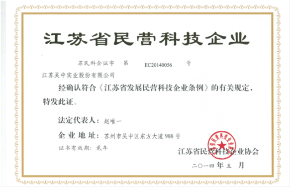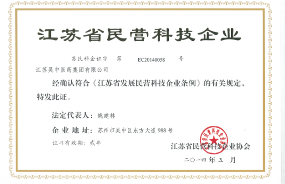 2014年江蘇吳中和吳中醫藥雙雙榮獲江蘇省民營科技企業協會發布 的“江蘇省民營科技企業”稱號。