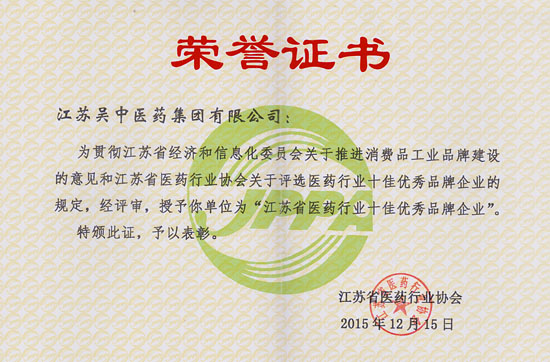 近日,經專家評審,江蘇吳中醫藥集團有限公司獲得“江蘇省醫藥行業十佳優秀品牌企業”。醫藥集團將一如既往學習其他優秀品牌企業的經驗,在經濟新常態下,奮發有為,為實現江蘇醫藥強省而努力。