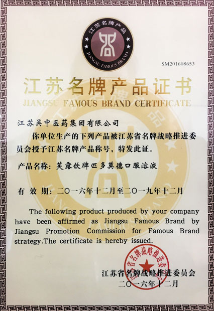 “芙露飲”匹多莫德口服溶液獲得江蘇名牌產品
