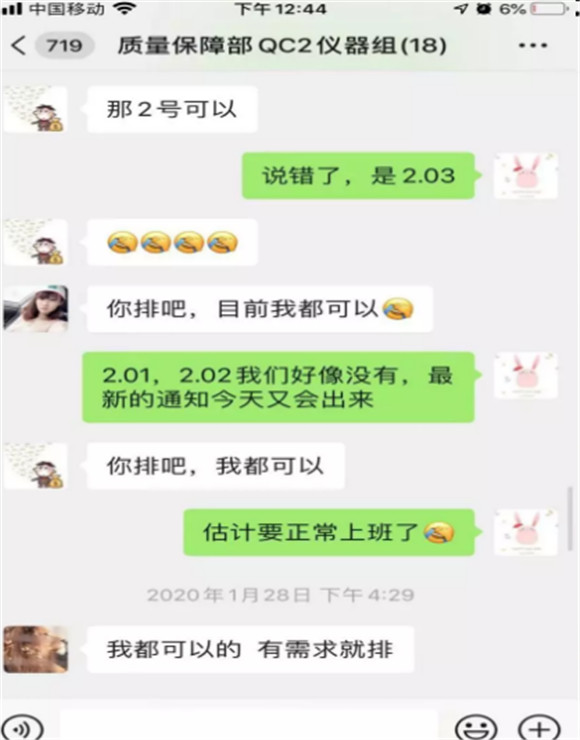 (春節(jié)假期,QC儀器組的微信群聊天記錄,大家紛紛表示只要工作有需要,自己隨時都能上!希望能為公司在最需要的時候獻出自己一份綿薄之力。)