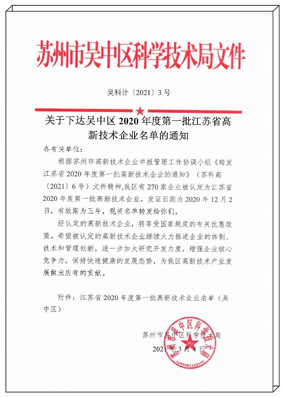 根據蘇州市高新技術企業申報管理工作協調小組《轉發江蘇省2020年度第一批高新技術企業的通知》(蘇科高〔2021〕6號),江蘇吳中醫藥集團有限公司獲評江蘇省高新技術企業,吳中醫藥自2008年來持續獲評該項榮譽。